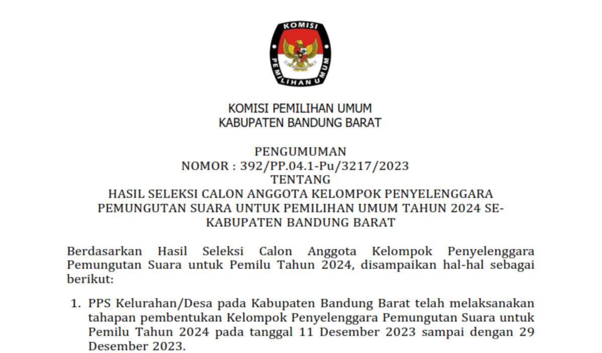 - PPS Kelurahan/Desa pada Kabupaten Bandung Barat telah menetapkan calon Anggota Kelompok Penyelenggara Pemungutan Suara terpilih dari Hasil Seleksi sebagaimana tercantum dalam lampiran Pengumuman PPS tentang Calon Anggota Kelompok Penyelenggara Pemungutan Suara Terpilih untuk Pemilihan Umum Tahun 2024 di masing-masing desa;