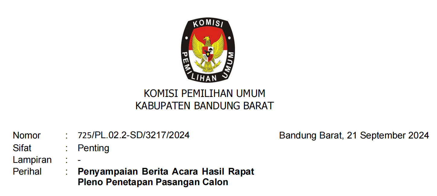 KPU BANDUNG BARAT - Berdasarkan Peraturan Komisi Pemilihan Umum No 8 Tahun 2024 Tentang Pencalonan Gubernur dan Wakil Gubernur, Bupati dan Wakil Bupati, Walikota dan Walikota sebagaimana telah diubah dengan Peraturan Komisi Pemilihan Umum No 10 Tahun 2024 Perubahan atas Peraturan Komisi Pemilihan Umum No 8 Tahun 2024 Tentang Pencalonan Gubernur dan Wakil Gubernur, Bupati dan Wakil Bupati, Walikota