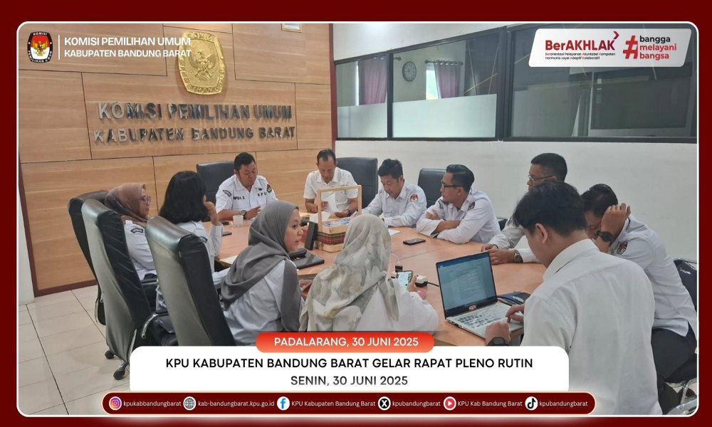 KPU BANDUNG BARAT - Komisi Pemilihan Umum (KPU) Kabupaten Bandung Barat menyelenggarakan rapat pleno rutin yang melibatkan Komisioner, Sekretaris, para Kepala Sub Bagian (Kasubag), serta fungsional di lingkungan sekretariat. Rapat dilaksanakan pada Senin, 30 Juni 2025, bertempat di Aula Bayu Baskoro, Kantor KPU Kabupaten Bandung Barat.