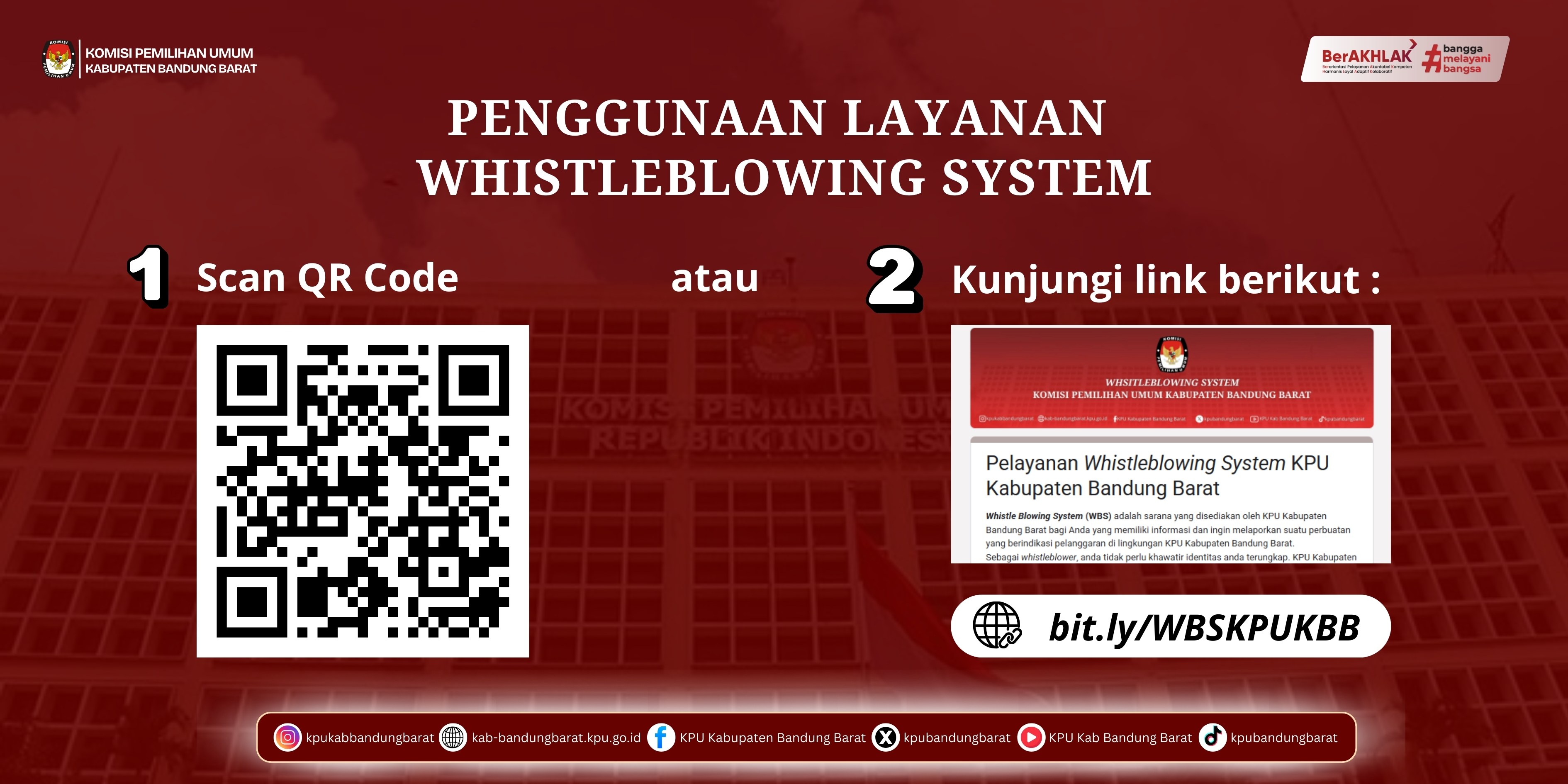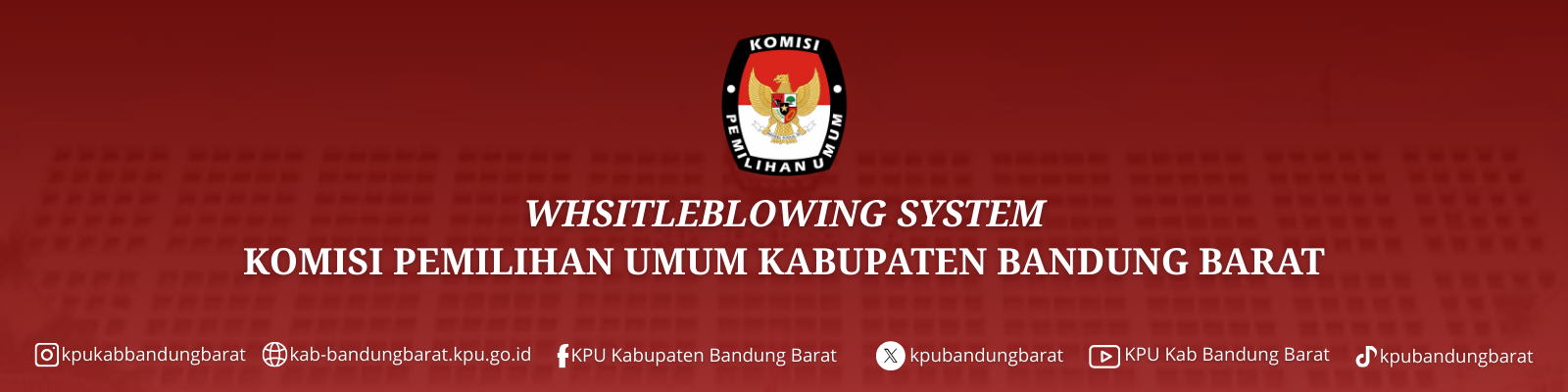Whistle Blowing System (WBS) adalah sarana yang disediakan oleh KPU Kabupaten Bandung Barat bagi Anda yang memiliki informasi dan ingin melaporkan suatu perbuatan yang berindikasi pelanggaran di lingkungan KPU Kabupaten Bandung Barat.